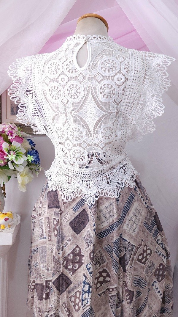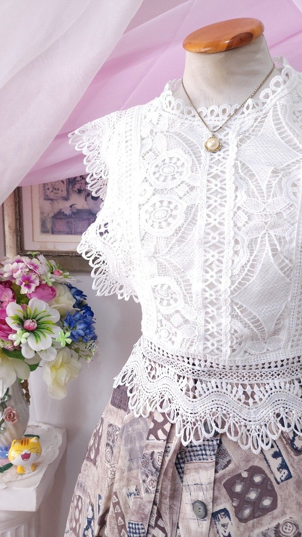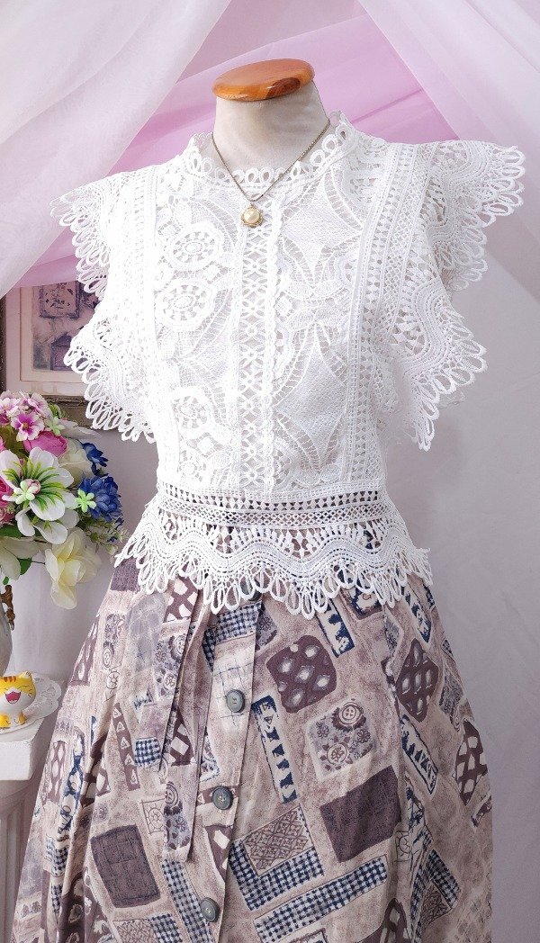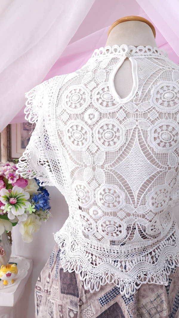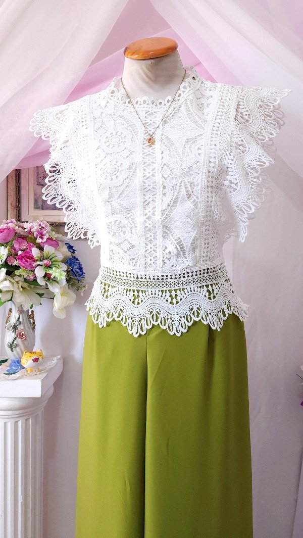 Íntegramente confeccionada en guipur, con detalle de voladitos en sus mangas y delantero qué la hacen única!