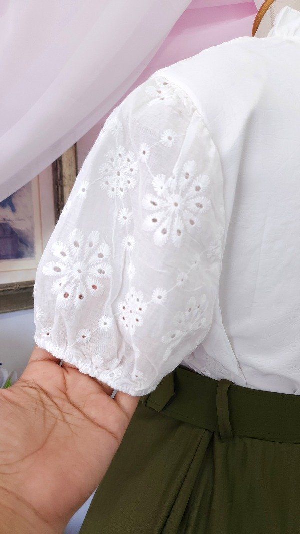 Confeccionada en broderie, algodon y poliéster es fresca y suave al tacto.